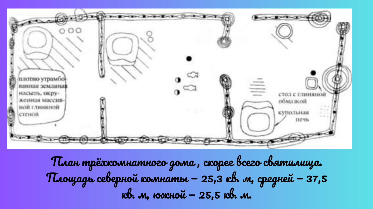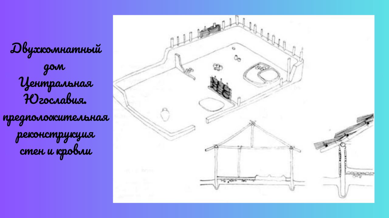 Второй тип домов, не уступающий мегаронам в размерах, это дома с закругленной торцевой стеной, их называют абсидные дома. Такие закругленные стены строились специально, чтобы выделить здание, показать его значение. У винчанцев эти здания служили для религиозных обрядов.